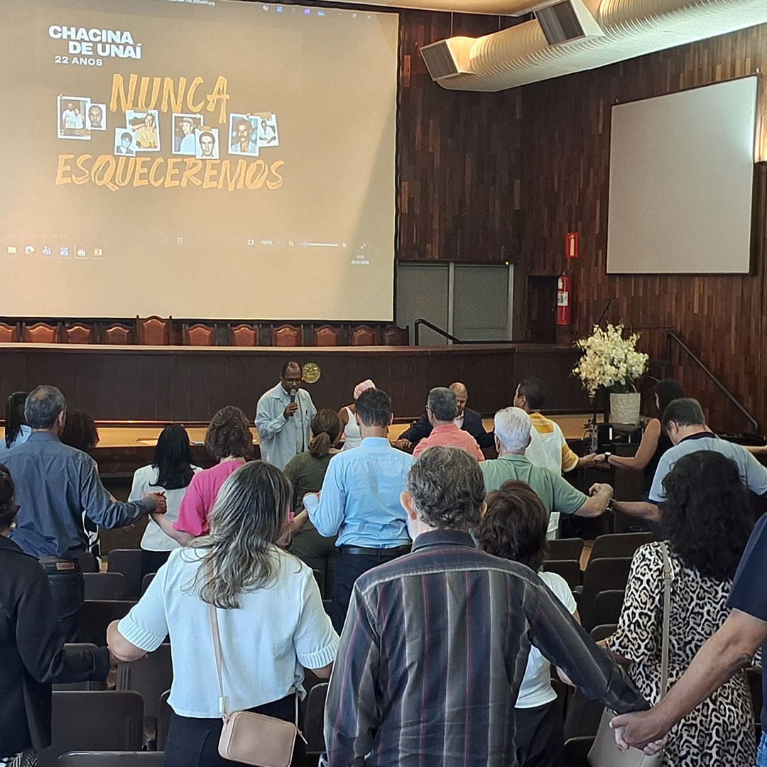 Para que essa tragédia jamais seja esquecida, os 22 anos da Chacina de Unaí foram marcados por ato carregado de emoção, realizado na Superintendência Regional do Trabalho de Minas Gerais, em Belo Horizonte, com a presença de diversos setores, das famílias e amigos das vítimas, gestores do Ministério do Trabalho e do Patrimônio Histórico, dentre auditores fiscais, desembargadores, juízes, representantes sindicais e religiosos.
